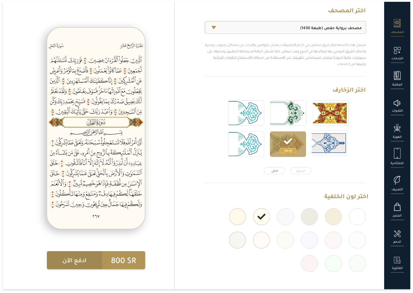 صمم خدمات مصحفك الإلكتروني بكامل الأريحية والسلاسة، واستعرض شكلها مباشرة قبل شراءها.